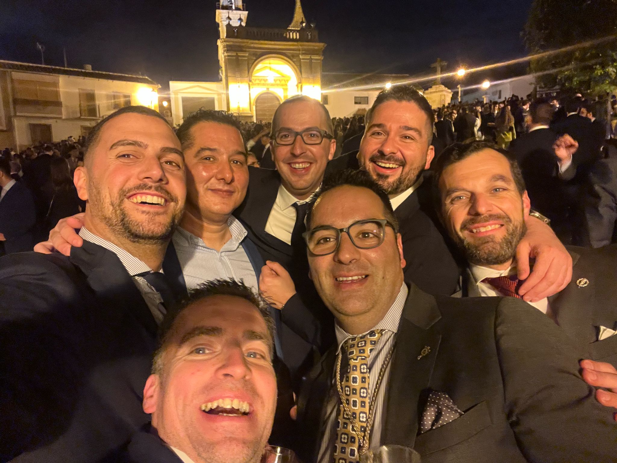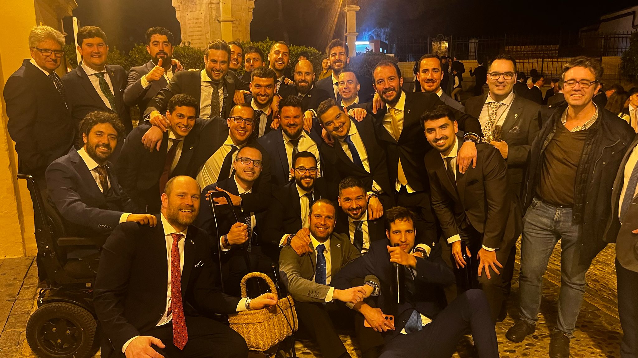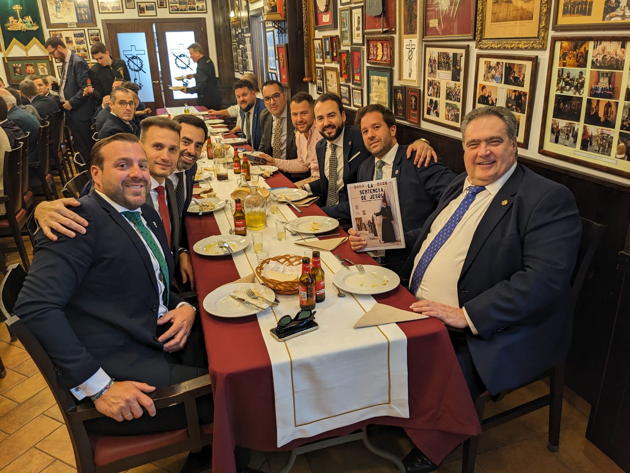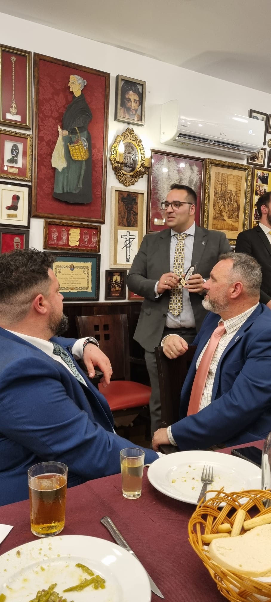 La mesa repleta de alegría, comentarios y buenos cánticos. Llega la noche, en el tapeo intervenciones de los hermanos, y llega el momento, para mí uno de los más bonitos y misteriosos, cuando se nombra al Hermano Ejemplar. El presidente se dirige al atril, todo el salón se oscurece y empieza la intervención, durante el relato algunas frases llamaron mi atención. Se escuchan unas voces y sólo una de ellas me sonaba, pero eso era imposible, y en ese momento de silencio se escuchó: Braulio Jesús Arcos Arcas, Hermano Ejemplar 2025. Levanto la mirada sorprendido y la imagen de ver entrar a mi familia en el salón y acompañarme en ese momento no tiene valor, y aún más sentarme y compartir mesa con todos al mismo tiempo.
